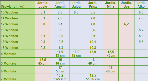 Untersuchungen: Hüfte: HD-A2, Knie: PL-0, Augen: i.O., Schilddrüse: i.O., Gentests: alle 3 negativ (zu den Befunden hier klicken)
