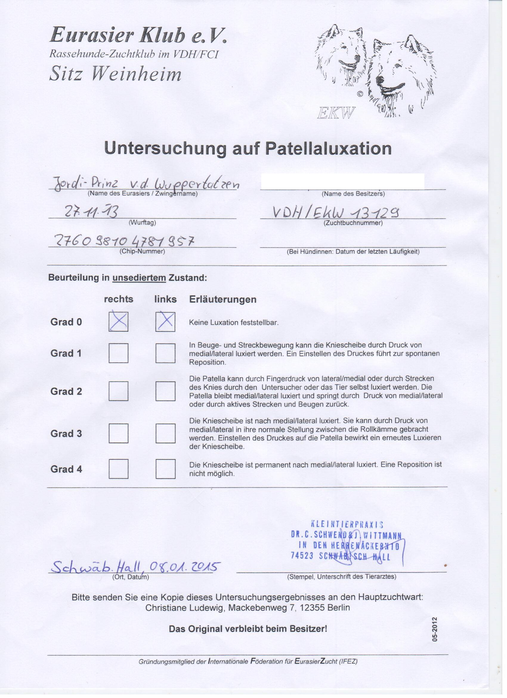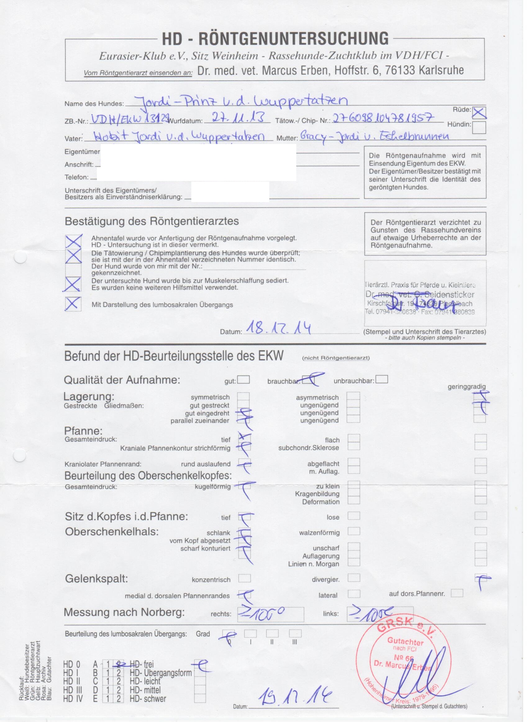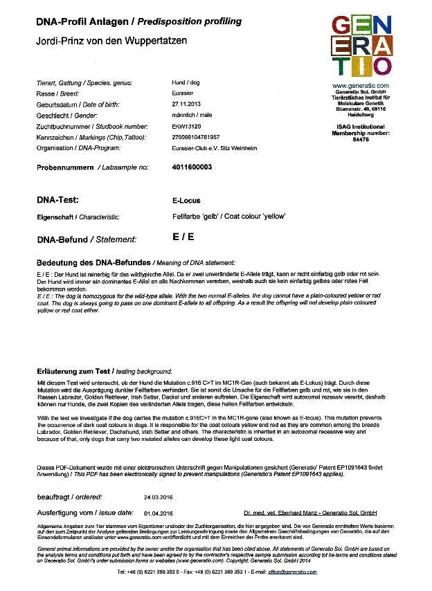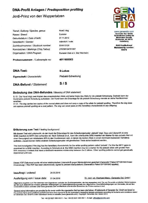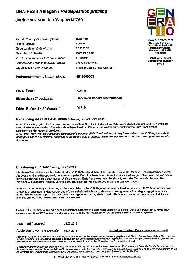 Untersuchungen: Hüfte: HD-A2, Knie: PL-0, Augen: i.O., Schilddrüse: i.O., Gentests: alle 3 negativ (zu den Befunden hier klicken)